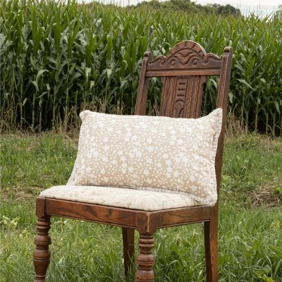 Bring your spring and summer spaces to life with this light and airy lumbar pillow. A dainty white floral pattern printed on a hand-woven tan base, finished with a blanket-stitched flange edge create a traditional cottage style pillow. Suitable for both indoors and outdoors, this pillow is made from recycled plastic bottles and UV stabilized.