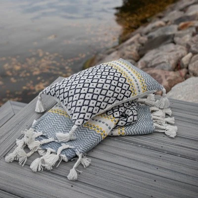 A magnificent woven geometric pattern in blue tones with just the right pop of yellow gives this pillow a fun and modern style. With braided tassels and a retro aesthetic, this pillow is perfect for brightening up your porch. Suitable for both indoors or out and made of recycled PET plastic with quality you can feel. Hand woven by artisans in India.