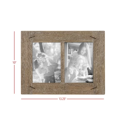 Display two favorite memories in style with the 5×7 multi-photo frame from Foreside Home and Garden. A beautiful natural wood border with metal staple details in each corner to add a unique rustic texture to the picture frame.