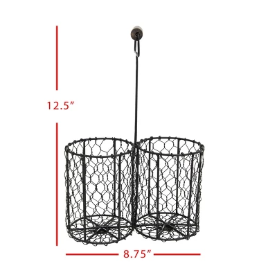 A traditional wine caddy format that offers a farmhouse feel. With the updated look of sleek chicken wire in a clean black finish, style this caddy in your hutch or on the buffet table to display two of your favorite bottles of wine. The turned wood handle makes this caddy both functional and stylish for your modern farmhouse kitchen.