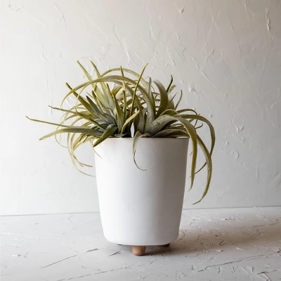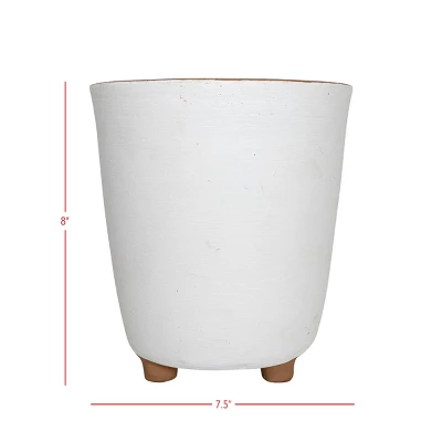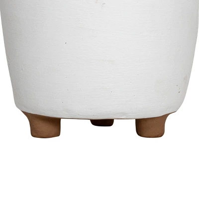 Hand thrown and hand painted, the natural terracotta clay is contrasted with a clean white painted exterior. Elevated by small feet, the large size of this modern style terracotta pot creates a home for flowering plants and robust greenery.