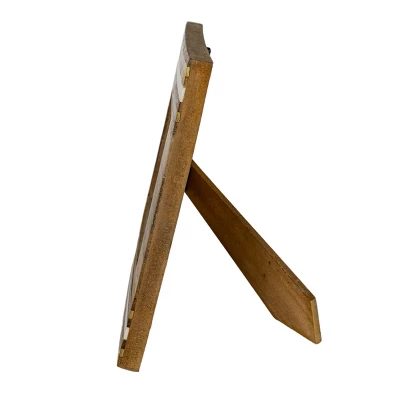 Natural sustainable mango wood is the base for this 4×6 picture frame. Alternating layers of pieced white resin stripes and brass metal clad strips are inlaid over the top to create a stunning frame to hold your favorite photo. The modern style frame can be hung or displayed on a table.