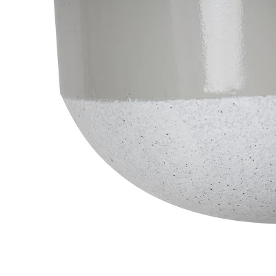 This hanging planter is characterized by a sleek glossy gray top, accented by a textural white finish with charcoal speckling at the base. The modern design is softened by a jute rope hanger and natural wood bead accents. The neutral coloration offers a look that is transitional within spaces and seasons, and also allows greenery and florals to truly be the center of attention with how they pop against it. The pot has one drainage hole at the base.