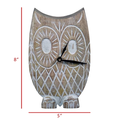 Accent your smaller tabletop spaces with a touch of whimsical boho when you add this owl-shaped clock. Made of sustainable mango wood, all of the intricate details on the owl are hand carved and washed over with a white rub finish to bring the figure to life. Two tiny carved feet at the base allow this clock to perch freely.