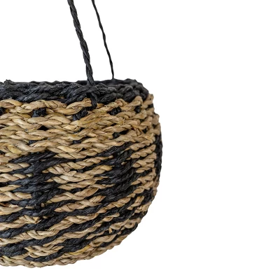 Modernize your farmhouse decor with a hanging basket featuring a geometric stripe pattern. Made of hand-woven natural seagrass fibers with bold black accents, this hanging basket is the perfect infusion of boho for your home. Add a small potted plant or your favorite faux flowers to the basket for an element of neutral texture.