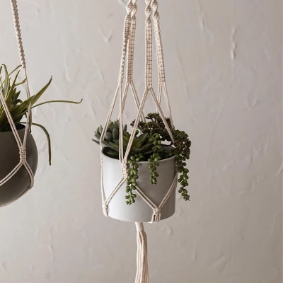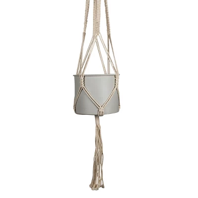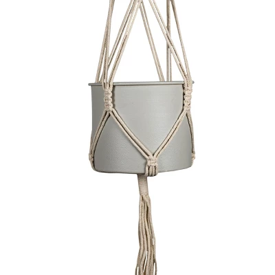 Hang your plants in decadence with this macrame hanging planter from Foreside Home & Garden. This lovely cylinder pot, in a neutral matte gray metal, rests comfortably in the macrame rope netting. Your arrangements will flourish as they float from this simply gorgeous display.