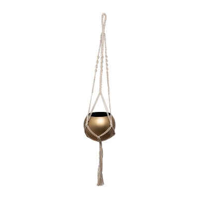 Raise the decadence of your plants with the Macramé Hanging Planter with Gold Cylinder or Round Metal Pot from Foreside Home & Garden. This lovely pot, in a rich metallic metal, rests comfortably in the macramé rope netting. Your arrangements will flourish as they float from this simply gorgeous display.