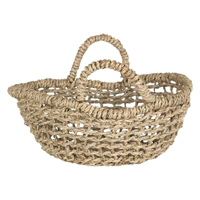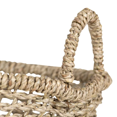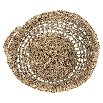 A hand woven natural basket that is flexible in its function as a tray or shallow bowl. This seagrass basket features an intricately woven pattern reminiscent of cane chairs, and finished with two sturdy handles. Its neutral color and transitional style work in most decor settings, but pairs especially well with boho, natural, and rustic aesthetics. Seagrass is a natural material made from plants. The material is harvested and then dried for weaving.