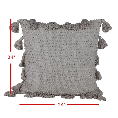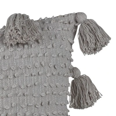 Elegantly soft and cozy, this large, oversized pillow from Foreside Home & Garden is a textural addition to your pillow selection. The gray solid color is given interest with small boucle knots and oversized tassels at each of the edges. This soft and subtle throw pillow is hand-woven by artisans in India.