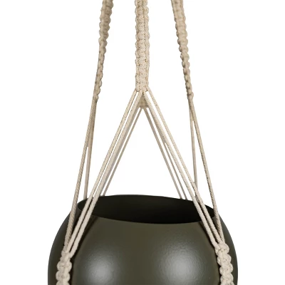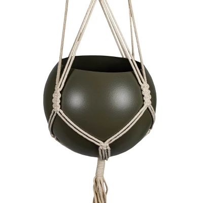 Hang your plants in decadence with this macrame hanging planter from Foreside Home & Garden. This lovely round pot, in an earthy green metal, rests comfortably in the macrame rope netting. Your arrangements will flourish as they float from this simply gorgeous display.