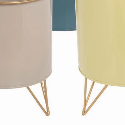 - Style: This set of 3 nesting metal bins feature a glossy enamel finish with brass hairpin legs. Large bin comes in blue, medium bin comes in yellow and small bin comes in taupe.