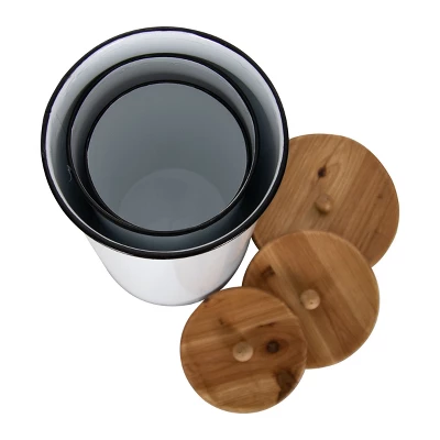 These canisters offer transitional storage in three sizes that make it easy to keep your small items organized. The clean, white enamel finish with sleek black detailing on the rims paired with the warm tone of the wood lids offer a timeless modern farmhouse aesthetic. The three sizes nest together for convenient storage when not in use.