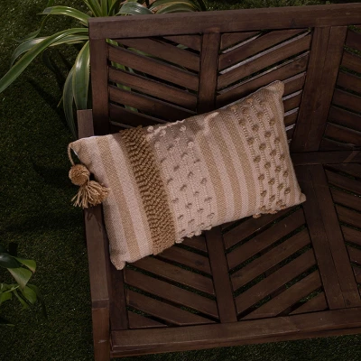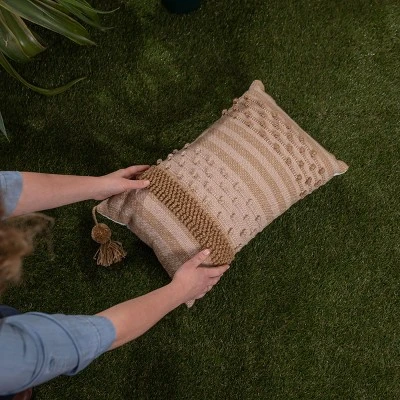 With its bold textural stripes and plain-woven tan toned base, this outdoor pillow from Foreside Home & Garden is a radiant and relaxing accent. With the single pom tassel, woven looped yarns and playful, boho personality this pillow is bound to be a hit! Hand-woven by artisans in India.