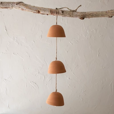 Liven up your space with this simple, yet beautiful tiered decorative bell exclusively from Foreside Home & Garden. Featuring three hand thrown terracotta clay bells tiered down and finished with a single mango wood ring chime delicately hanging at the bottom. The natural jute hanger paired with the warm terracotta adds just the right amount of boho dimension when hung in any environment.